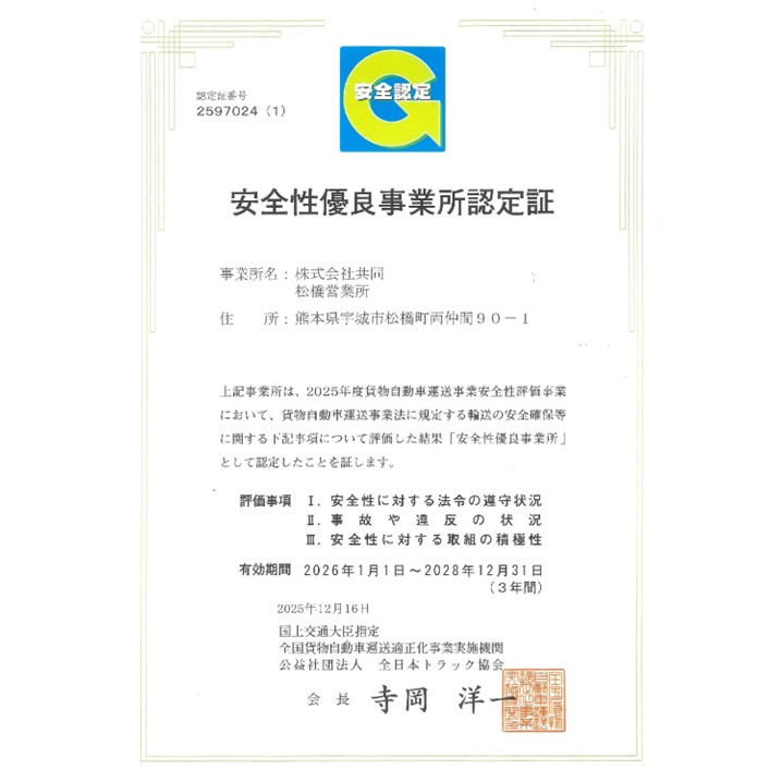 当社・松橋営業所は、全国トラック協会が実施する「安全性優良事業所認定制度(Gマーク制度)」において、2025年度の更新認定を取得いたしました。