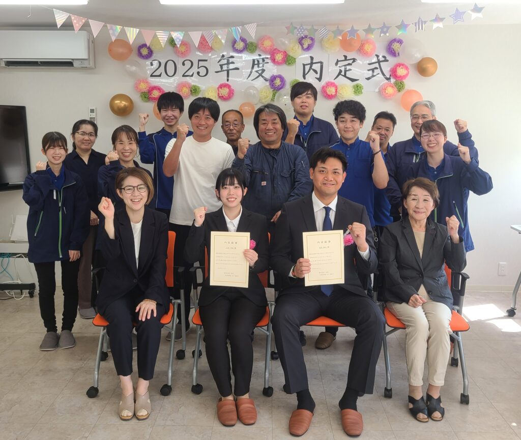 2025年10月1日、本社にて2026年度入社予定者の内定式を執り行いました。 当日は、社長をはじめ各部門より社員が出席し、内定者一人ひとりに内定証書を授与しました。 あたたかい雰囲気の中、内定者代表より堂々とした挨拶が […]